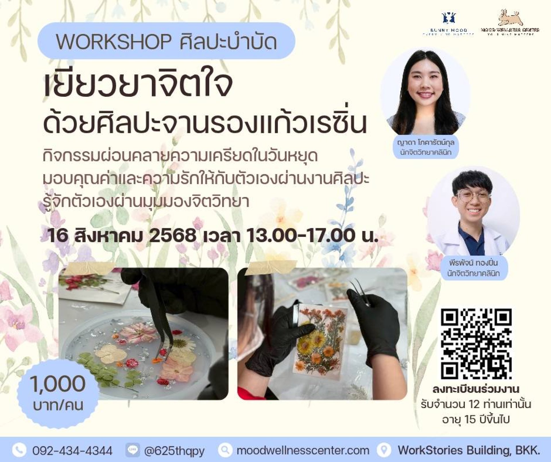 บันนี่มูดเชิญชวนทุกคนมาเยียวยาจิตใจจากความเหนื่อยล้า ผิดหวัง และอ่อนแอ ผ่านการทำกิจกรรมศิลปะบำบัด ด้วยการทำจานรองแก้วเรซิ่นตกแต่งด้วยดอกไม้มอบเป็ยของขวัญให้ตนเองที่มีเพียงชิ้นเดียวในโลก